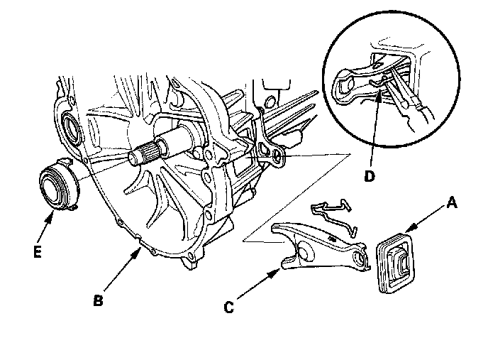 2. Remove the release fork (C) from the clutch housing (B) by squeezing the release fork set spring (D) with pliers. Remove the release bearing (E).