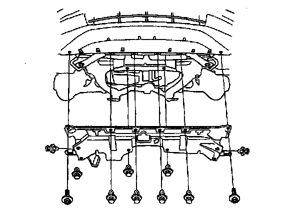 12. Align the reference marks (A) with edge (B) of both rear stiffer (C), and tighten the rear subframe mounting bolts, then front bolts, and tighten the stiffener bolts to the specified torque.