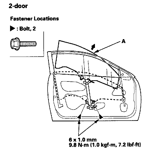 4. Carefully raise the glass (A) until you can see the bolts, then remove them. Carefully pull the glass out through the window slot. Take care not to drop the glass inside the door.