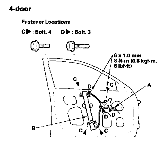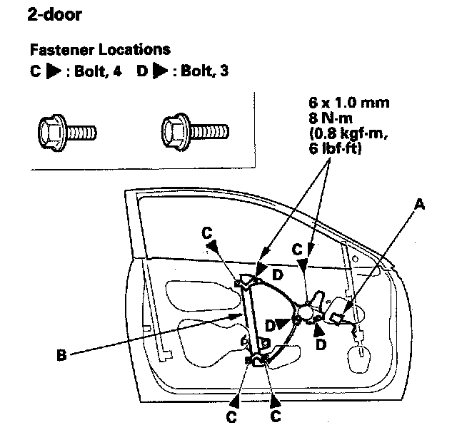 6. Remove the bolts (C), and loosen the bolts (D), then remove the regulator through the hole in the door.