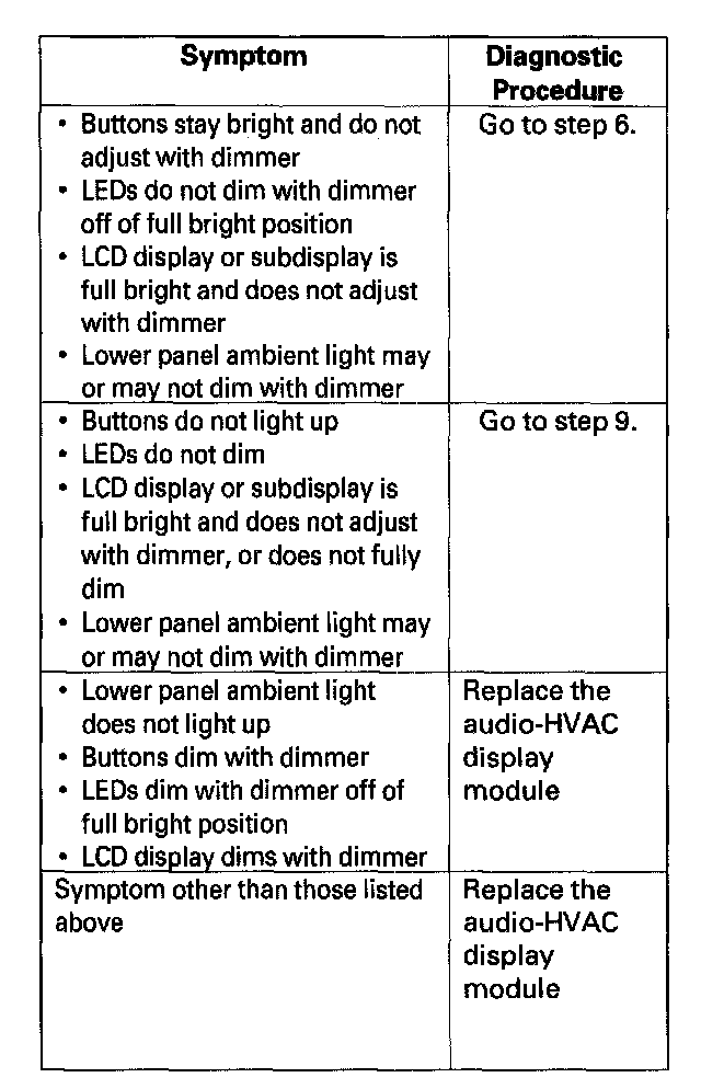 Audio-HVAC Display Module Illumination TroubleshootingNOTE: If the display is blank when the headlights are off, the problem is not in the illumination circuit.