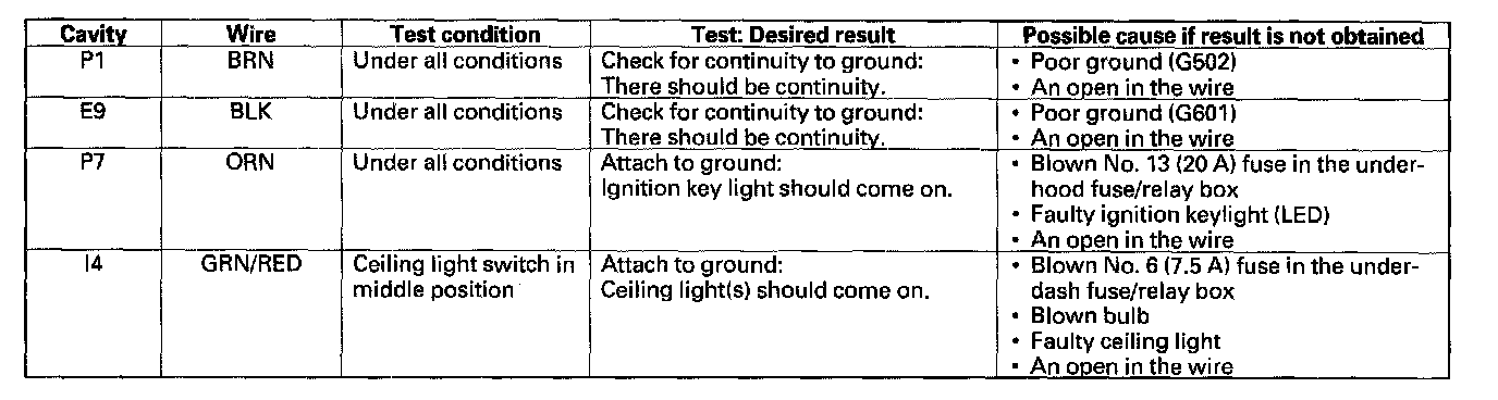 7. Turn the ignition switch to ON (II) to keep the system awake and make these input tests at the appropriate connectors on the under-dash fuse/relay box