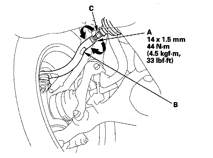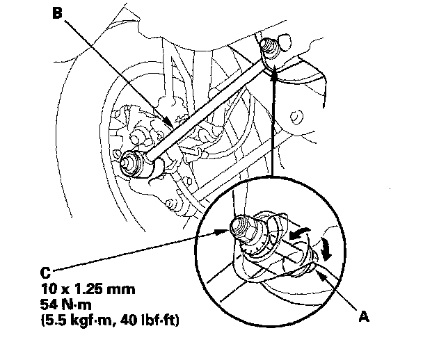 3. Hold the adjusting bolt (A) on the rear control arm (B), and loosen the self-locking nut (C).