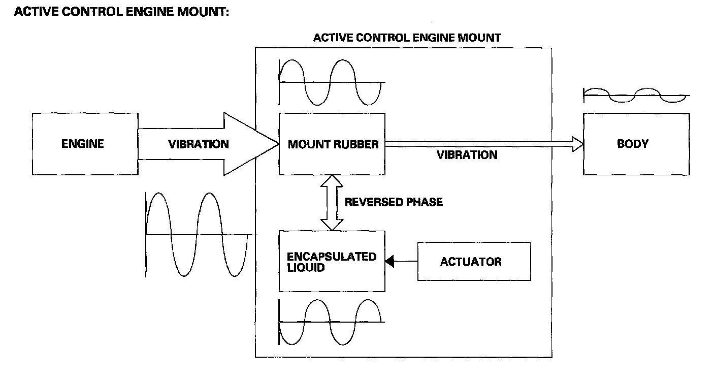The active control engine mount (ACM) system decreases engine-to-chassis vibration at low rpm and when the engine is in cylinder pause mode. The system includes conventional, liquid-filled engine mounts that absorb vibration. In addition, the front and rear engine mount contains an actuator that cancels engine vibration by producing a counter, or reverse vibration. The transmission has standard rubber mounts.