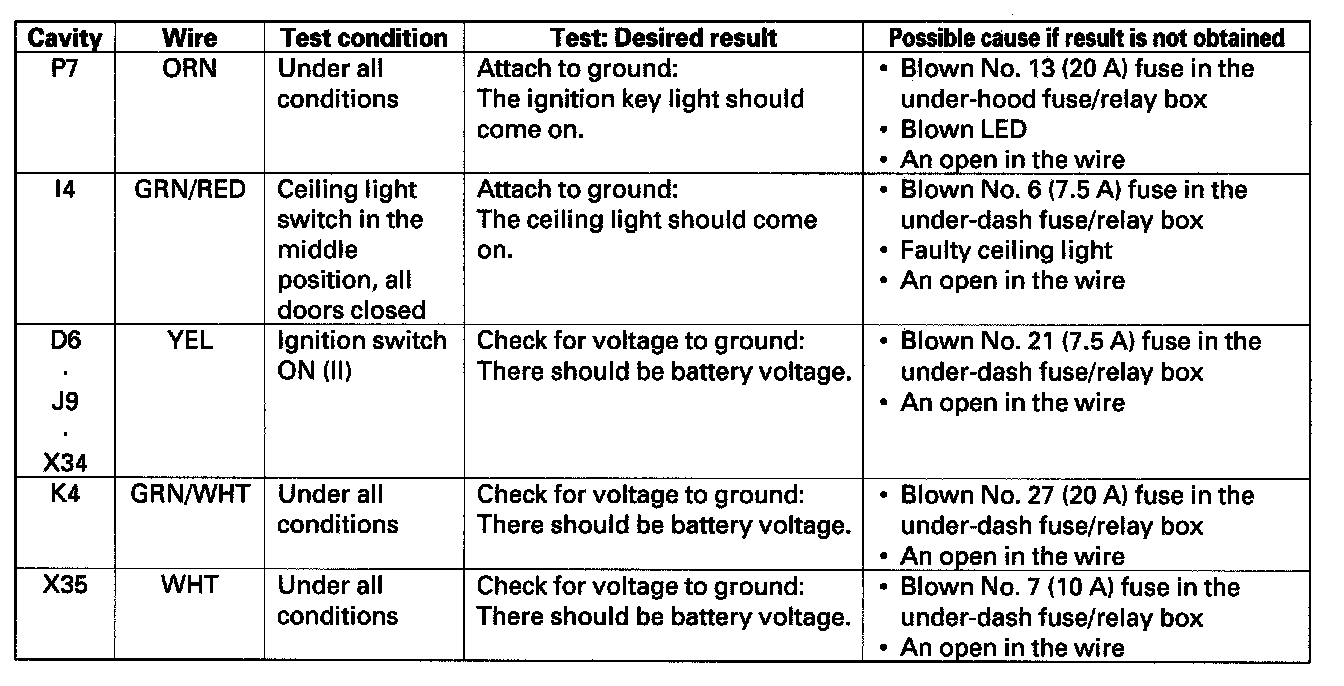 5. Reconnect the connectors to the under-dash fuse/relay box, and make sure these input tests at the appropriate connectors on the under-dash fuse/relay box.