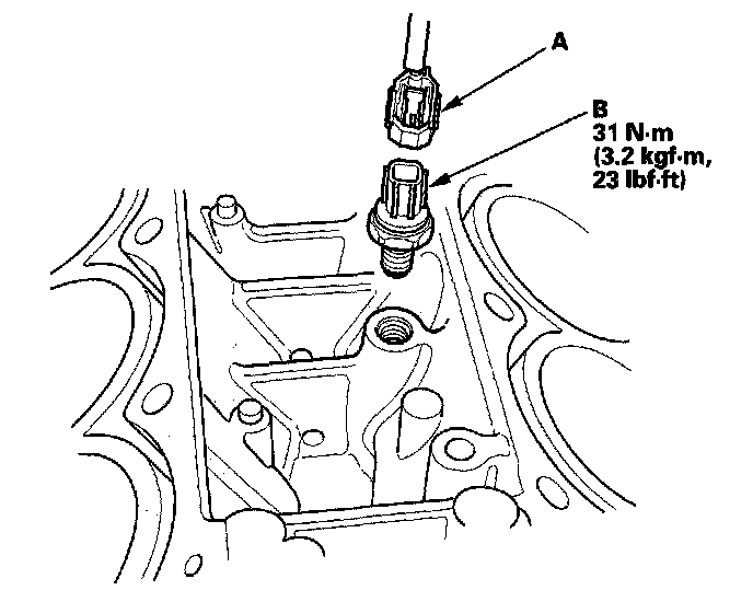 3. Disconnect the knock sensor connector (A), then remove the knock sensor (B).