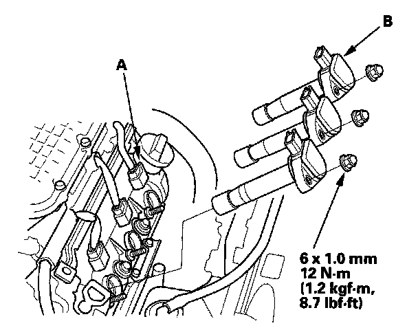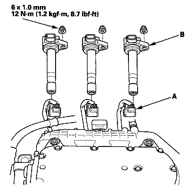 3. Disconnect the ignition coil connectors (A), then remove the front bank ignition coils (B).