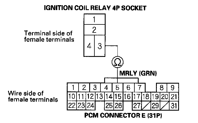 NO - Repair an open in the wire between ignition coil relay 4P socket terminal No. 3 and the PCM (E5).