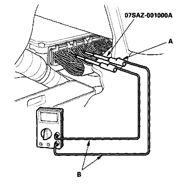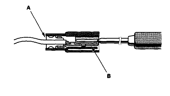 3. If you cannot get to the wire side of the connector or the wire side is sealed (A), disconnect the connector and probe the terminals (B) from the terminal side. Do not force the probe into the connector.