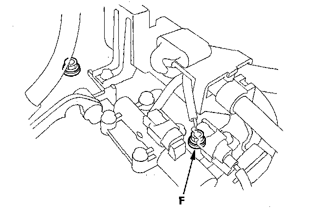 25. Shift to the D position, and measure the 4th clutch pressure at the 4th clutch pressure inspection hole (F) while holding the engine speed at 2,000 rpm, then in about 15 seconds, the transmission will shift to the 5th gear.