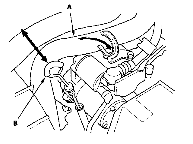 4. Remove the lower radiator hose (A) from it clamp, and remove the transmission dipstick (B).