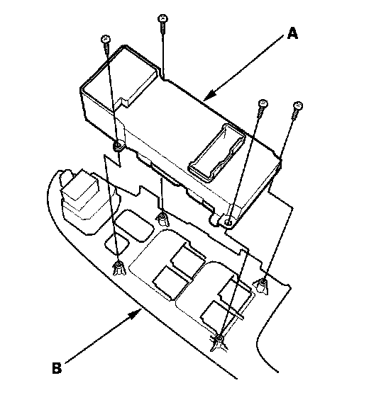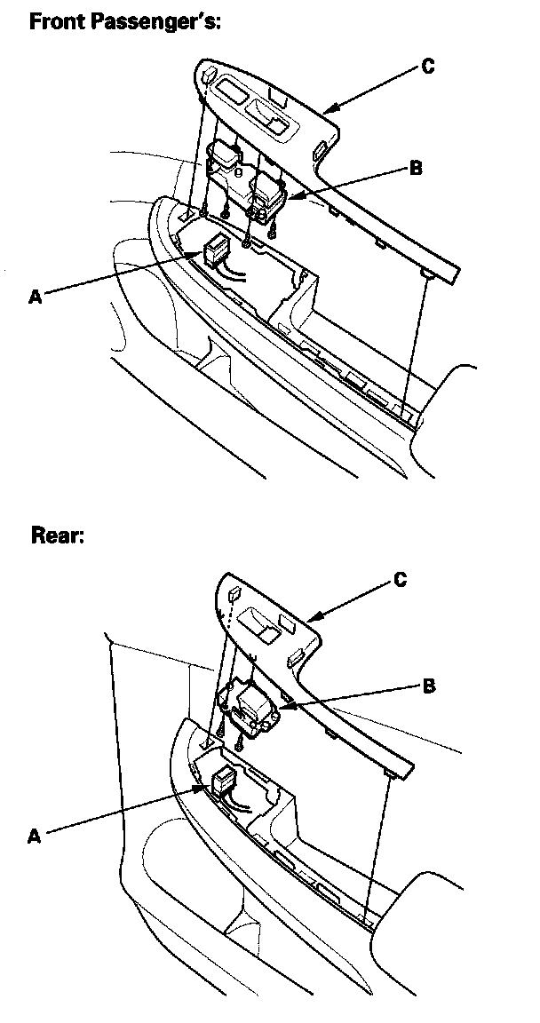 2. Disconnect the power window switch connector (A), then remove the three mounting screws and the power window switch (B) from the switch trim (C).