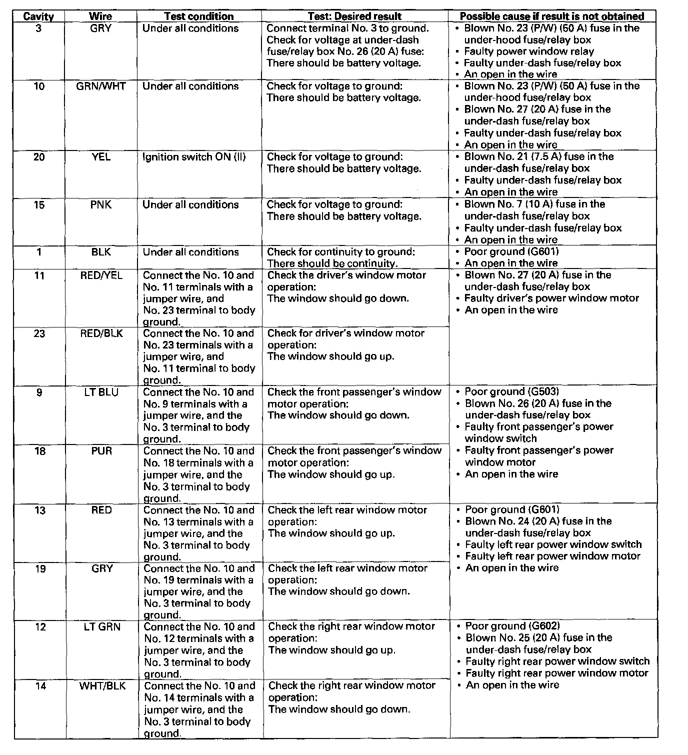 5. With the power window master switch still disconnected, make these input tests at the connector