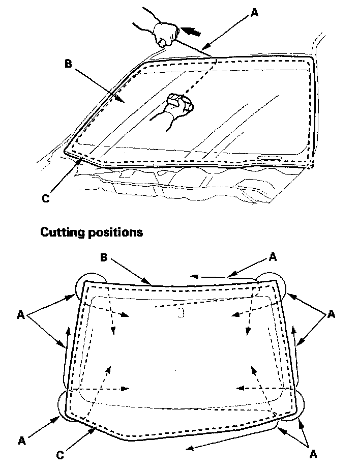 6. With a helper on the outside, pull the piano wire (A) back and forth in a sawing motion. Hold the piano wire as close to the windshield (B) as possible to prevent damage to the body and dashboard. Carefully cut through the rubber dam and adhesive (C) around the entire windshield.