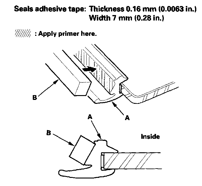 13. Apply primer to the molding (A), then attach the molding upper seal (B) with adhesive tape to the inside surface of the molding as shown: