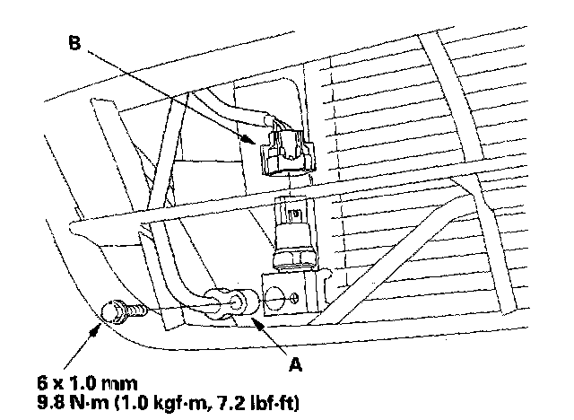 8. Remove the bolt, then disconnect the receiver line (A) from the condenser. Disconnect the A/C pressure switch connector (B).