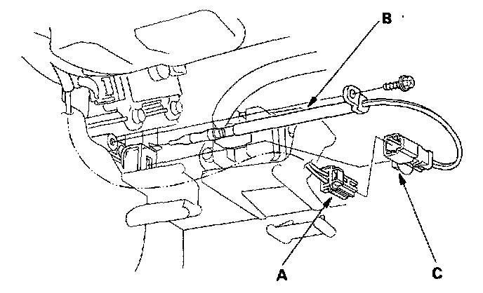 3. Disconnect the 2P connector (A) from the evaporator temperature sensor (B), then remove the connector clip (C). Remove the self-tapping screw, aid carefully pull out the evaporator temperature sensor.