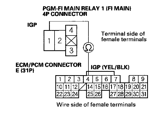 27. Check for continuity between body ground and PGM-FI main relay 1 (FI MAIN) 4P connector terminals No.2 and No.3 individually.