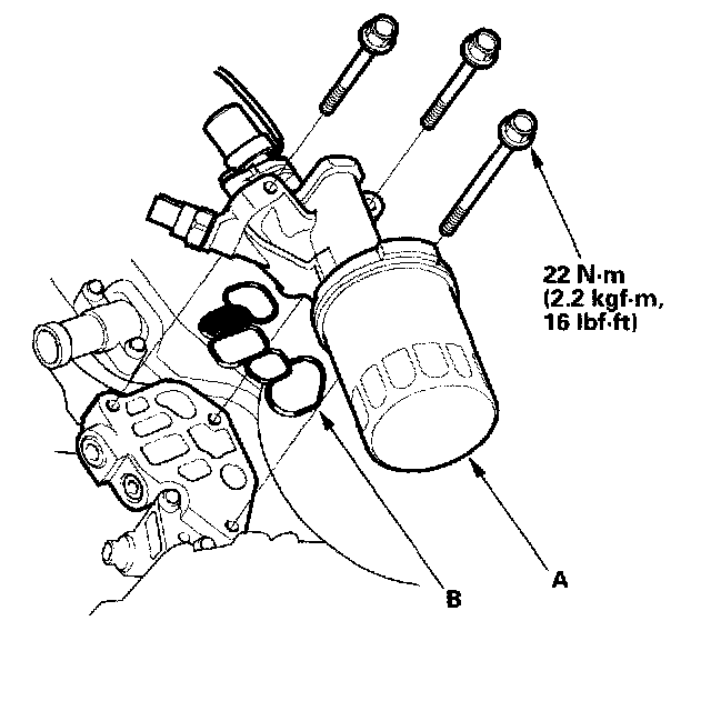 3. Remove the VTEC solenoid valve/oil filter assembly (A) from the oil pump, and check the VTEC solenoid valve filter (B) for a restriction. If there is a restriction, replace the VTEC solenoid valve filter, the engine oil filter, and the engine oil.