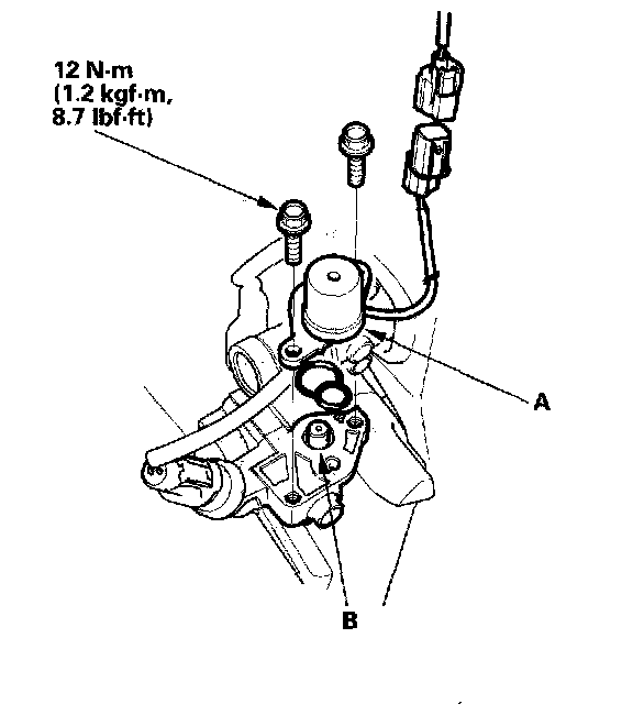 4. If the filter is not restricted, remove the VTEC solenoid valve (A) and push the valve (B) with your finger to check its movement. If the valve moves freely, it is normal, check the engine oil pressure. If the valve binds or sticks, replace the VTEC valve assembly.