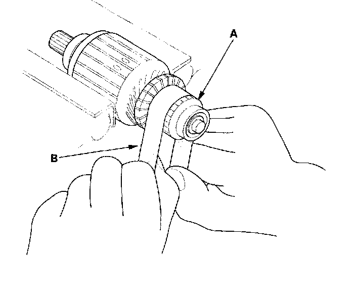 19. If the starter drive gear (B) is worn or damaged replace the overrunning clutch assembly; the gear is not available separately.
