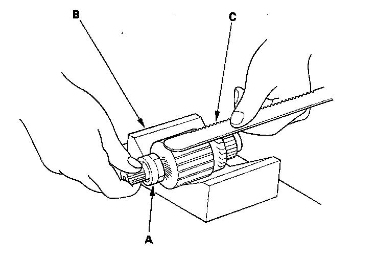 9. Place the armature (A) on an armature tester (B). Hold a hacksaw blade (C) on the armature core. If the blade is attracted to the core or vibrates while the core is turned, the armature is shorted. Replace the armature.