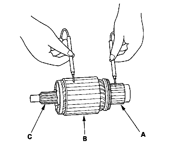 10. Check with an ohmmeter for continuity between the commutator (A) and armature coil core (B), and between the commutator and armature shaft (C). If there is continuity, replace the armature.