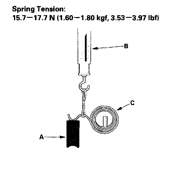 13. Insert the brush (A) into the brush holder, and bring the brush into contact with the commutator, then attach a spring scale (B) to the spring (C). Measure the spring tension at the moment the spring lifts off the brush. If the spring tension is not within specification, replace the spring.