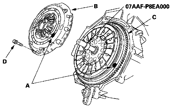 4. Align a white mark (A) across the pressure plate (B) and flywheel (C).