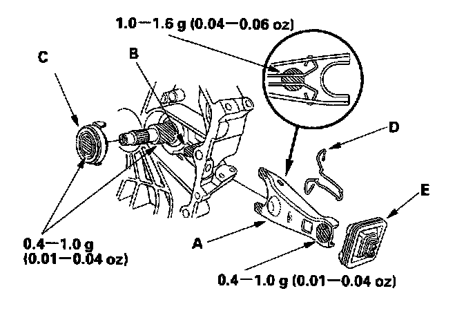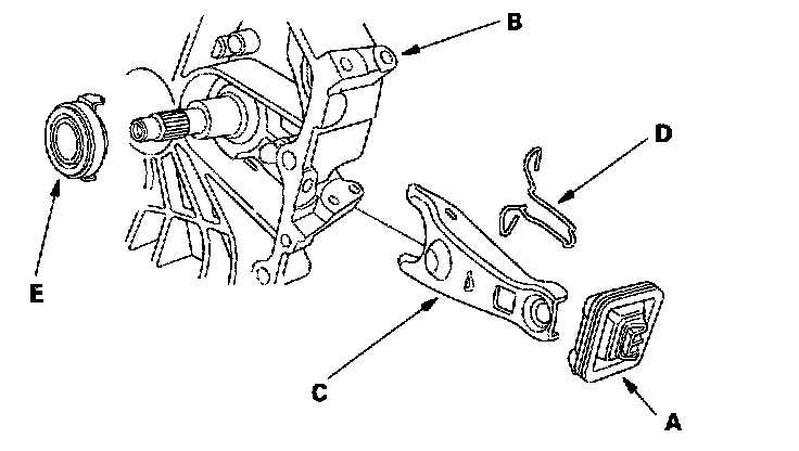 2. Remove the release fork (C) from the clutch housing (B) by squeezing the release fork set spring (D). Remove the release bearing (E).