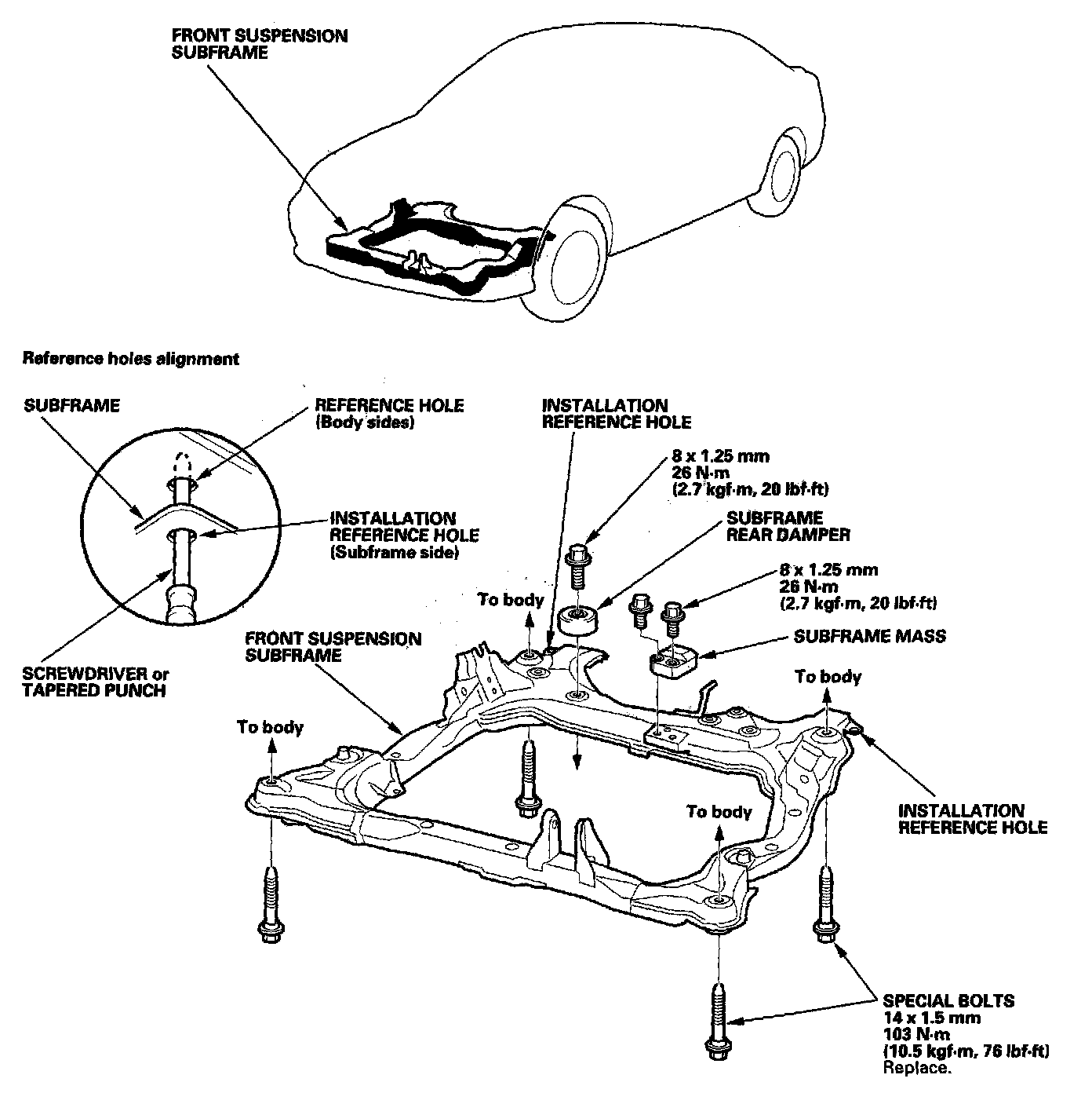 After loosening the subframe mounting bolts, be sure to replace them with new ones.