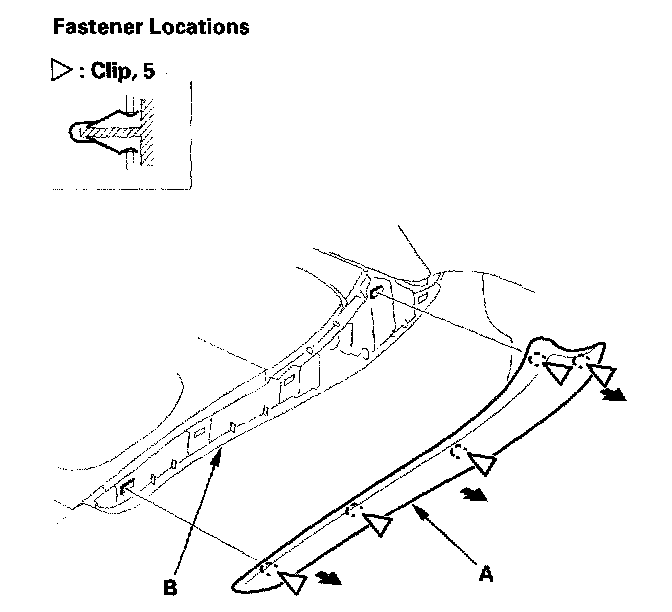 2. Carefully insert a trim tool next to the clips, and detach the clips by prying on the panel side trim (A), then remove it from the center console (B).