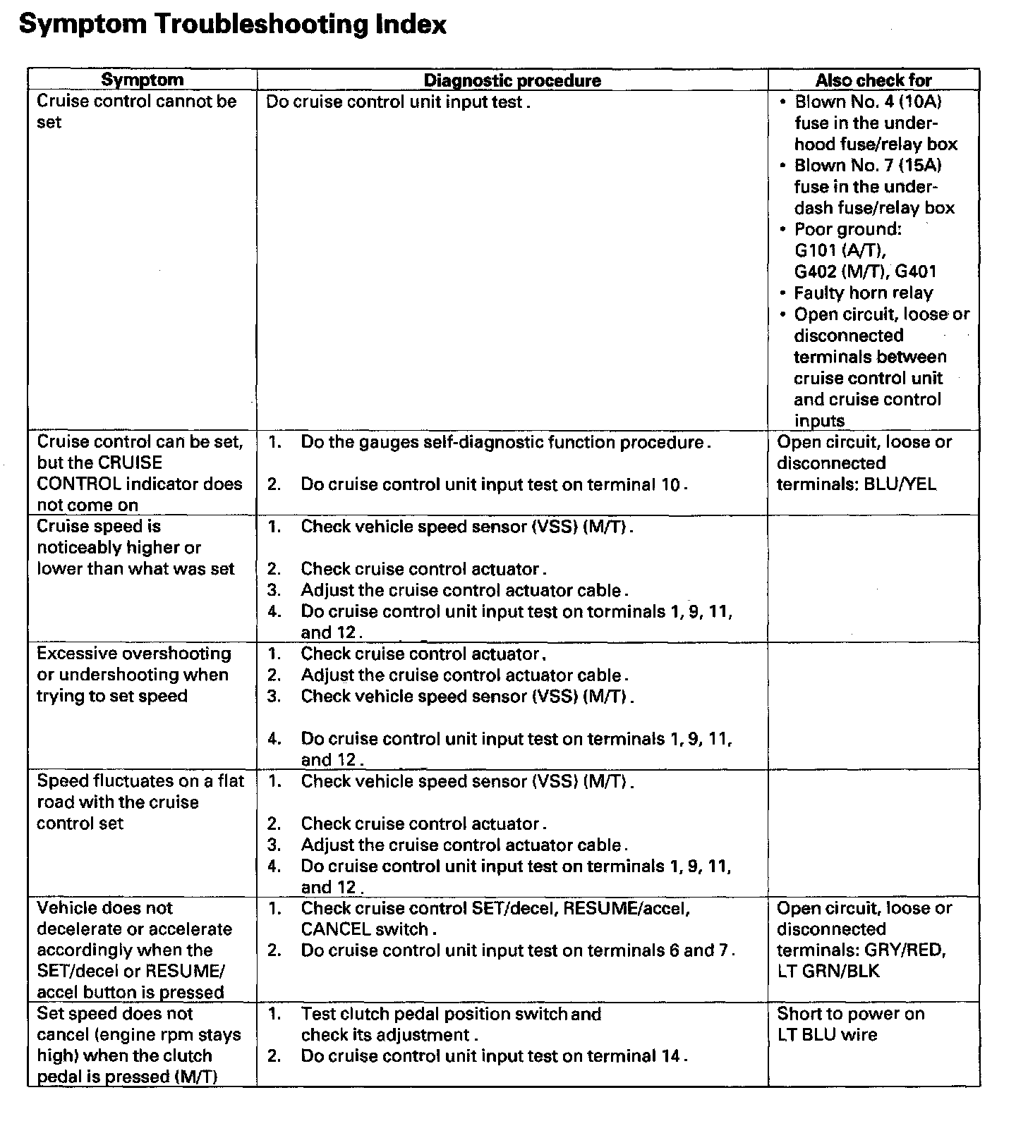Cruise Control Symptom Troubleshooting Index:
