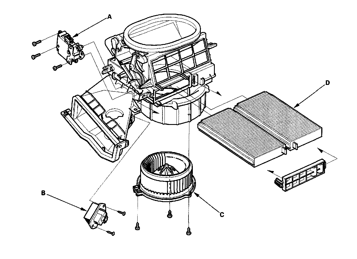 - The recirculation control motor (A), the power transistor (B), the blower motor (C), and the dust and pollen filters (D) can be replaced without removing the blower unit.