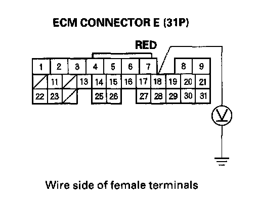 13. Using a back probe set, measure the voltage between the No.18 terminal of ECM connector E (31P) and body ground with the ECM connectors connected.