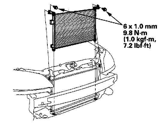 4. Remove the mounting bolts, then remove the condenser by lifting it up. Be careful not to damage the radiator and condenser fins when removing the condenser.