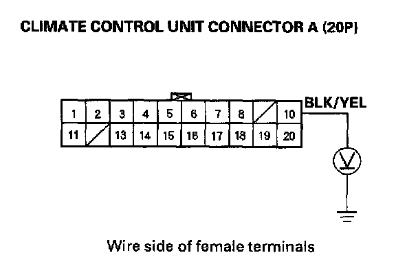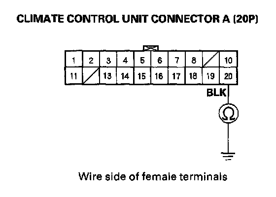 6. Check for continuity between the No.20 terminal of climate control unit connector A (20P) and body ground.