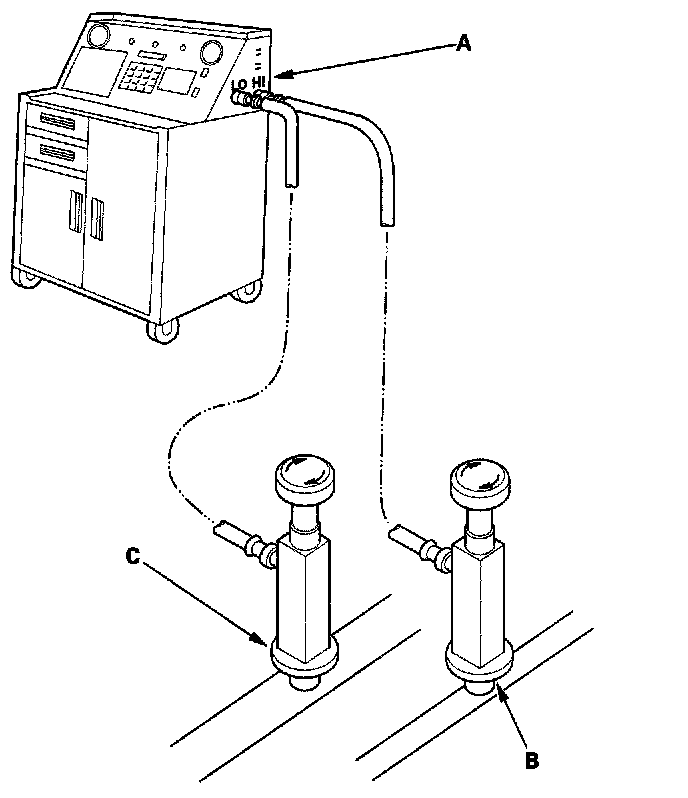 1. Connect a R-134a refrigerant recovery/recycling/charging station (A) to the high-pressure service port (B) and the low-pressure service port (C), as shown, following the equipment manufacturer's instructions.