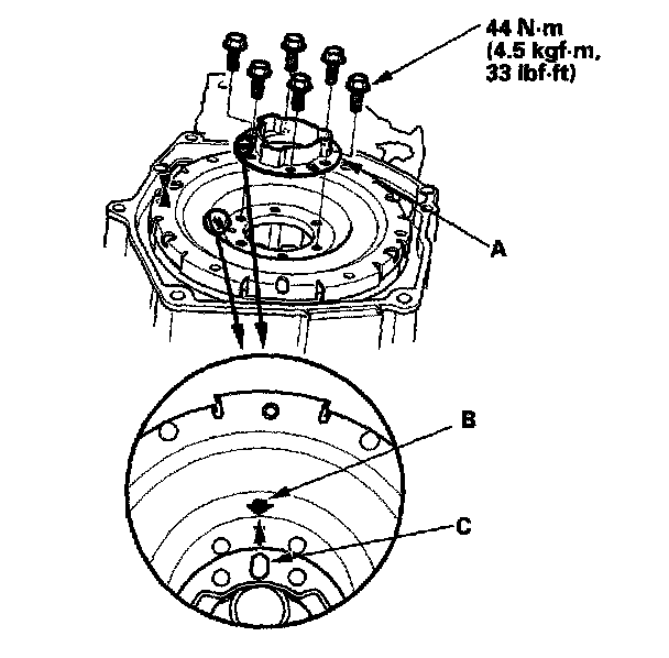 NOTE: When installing the support, align the mark (B) on the drive plate and the hole (C) on the support.