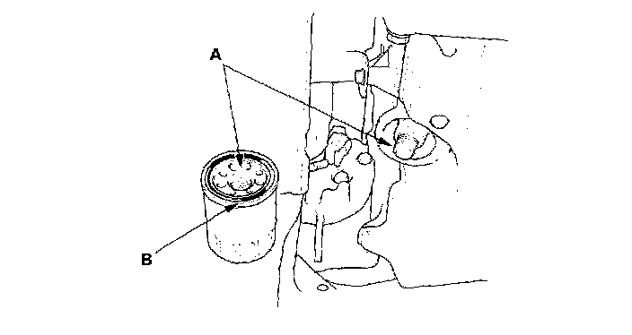 3. Inspect the threads (A) and rubber seal (B) on the new filter. Wipe off the seat on the oil pan, then apply a light coat of oil to the filter rubber seal. Use only filters with a built-in bypass system.