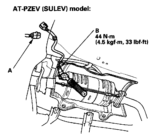 1. Disconnect the secondary HO2S 4P connector (A), then remove the secondary HO2S (B).