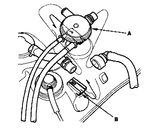 2. Remove the fuel tank vapor control valve (A) from the fuel tank (B).