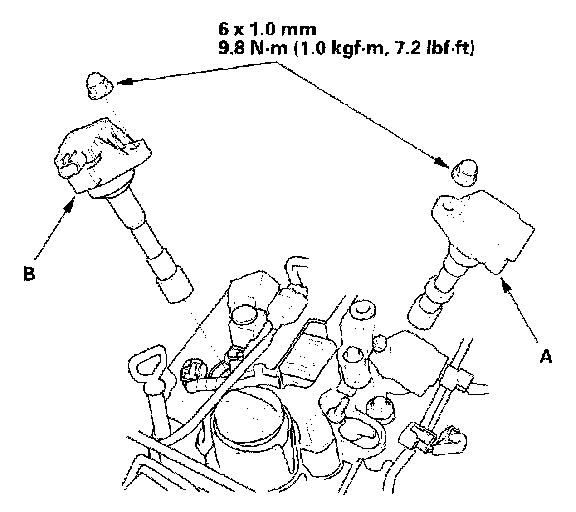 2. Disconnect the ignition coil connectors, then remove the front ignition coils (A) and rear ignition coils (B).