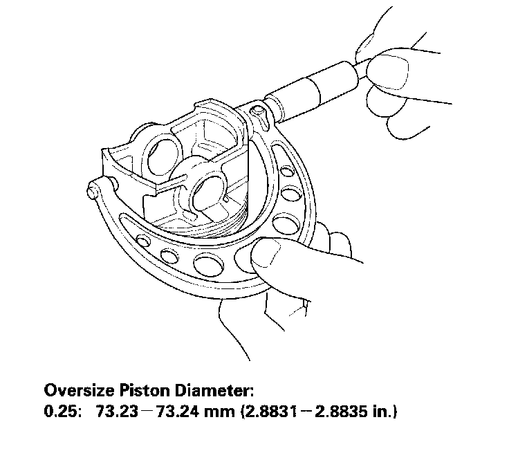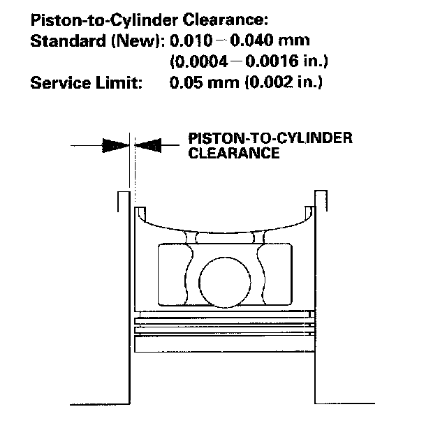 7. Calculate the difference between the cylinder bore diameter and the piston diameter. If the clearance is near or exceeds the service limit, inspect the piston and cylinder block for excessive wear.