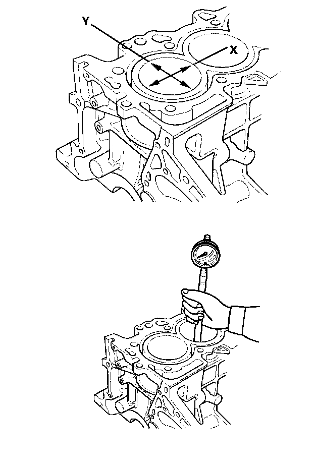 4. Measure wear and taper in direction X and Y at three levels in each cylinder as shown. If measurements in any cylinder are beyond the Oversize Bore Service Limit, replace the block. If the block is to be rebored, refer to step 7 after reboring.