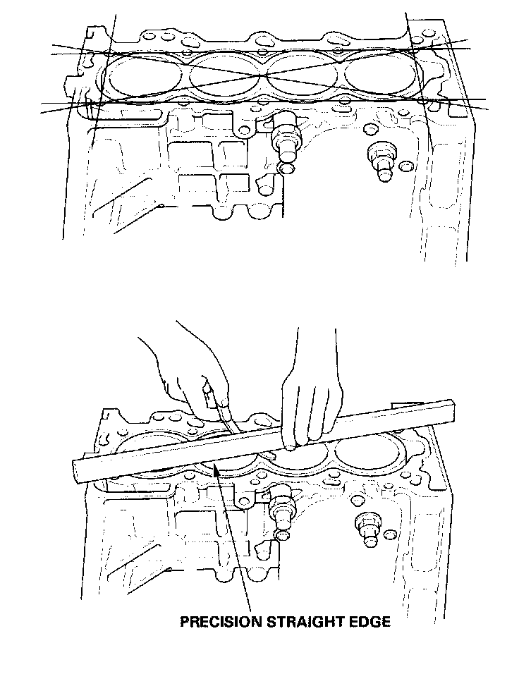 6. Check the top of the block for warpage. Measure along the edges and across the center as shown.