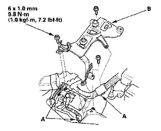 4. Remove the harness clamps (A), then remove the air cleaner housing stay (B).