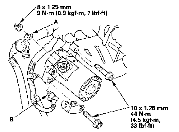 5. Disconnect the starter cable (A) from the B terminal, then disconnect the BLK/WHT wire (B) from the S terminal.