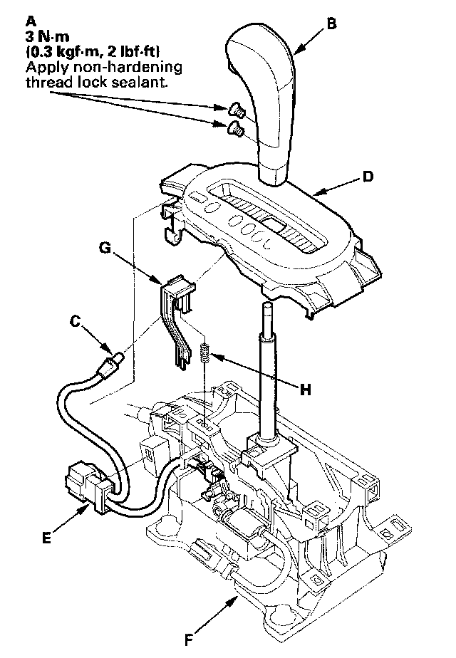 6. Remove the shift lock release (G) and spring (H).