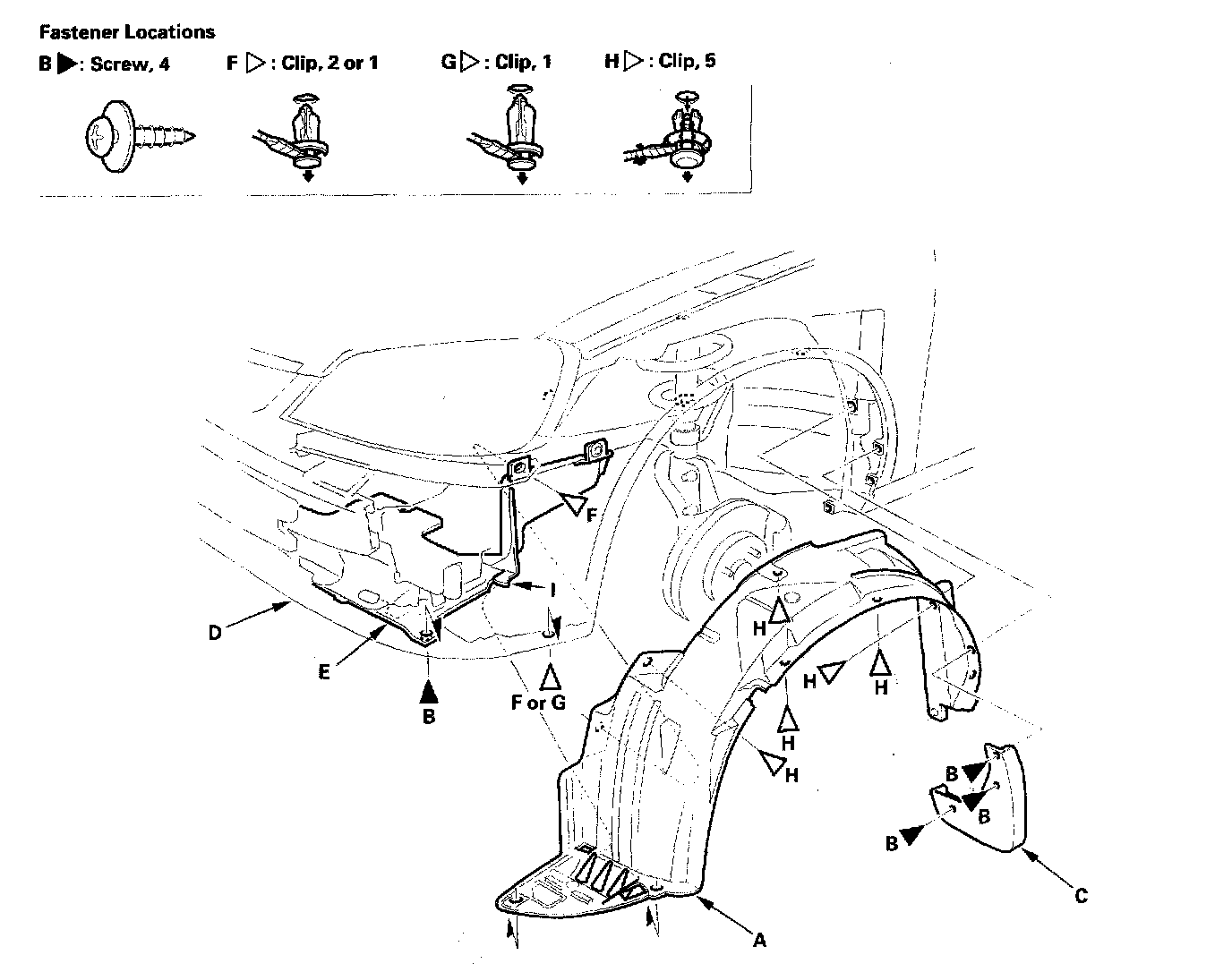 3. From the wheel arch, remove the clips (F, H) securing the front inner fender (and splash shield) on the body.